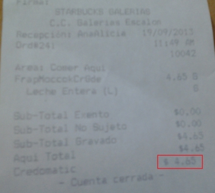 Today I went to Starbucks in San Salvador to celebrate the start of my vacation with a cup of coffee. I asked the Barrista which is the most popular coffee that they sell. He told me that is the "Frap Moccok" so I said OK but without asking the price.