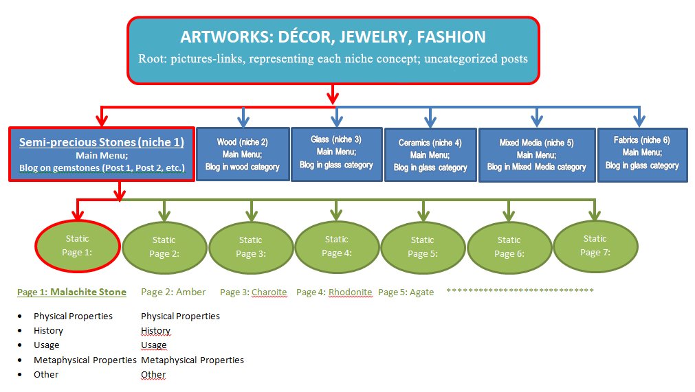 Do you see where I am going with this? Yes, I am interested in applied arts. Yes, the concept is too broad for one niche, but... as I move forward, I don't want every niche to have its own domain, and I don't want to manage multiple websites, because these niches well over-cross. Eventually, I'd like to have one website, which will help artisans and art lovers. Luckily, I thought about this before selecting a domain name for my site. Therefore, I chose the name tied to arts rather than directly to gemstones.