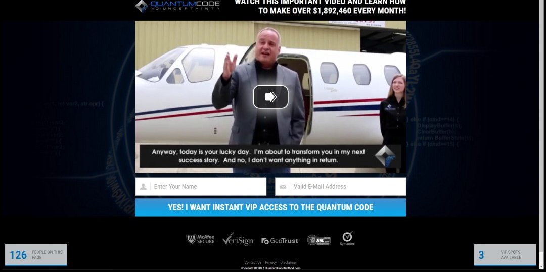 The guy in the video is a fiverr actor and the plane in the background is a rental plane. Look at the claims of the money you can make at top right in the picture. (1.8 million dollars a month, lol) and look at the scarcity counters bottom left and bottom right.