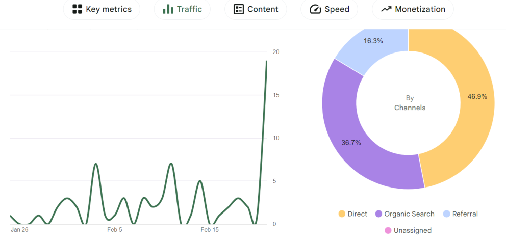 This morning, as I eagerly checked my site analytics through Google Site Kit, I was met with a delightful surprise. The number of visitors had jumped several times more than the previous day. Even more promising was the notable increase in organic search and direct visits, coupled with a decline in referral visits.