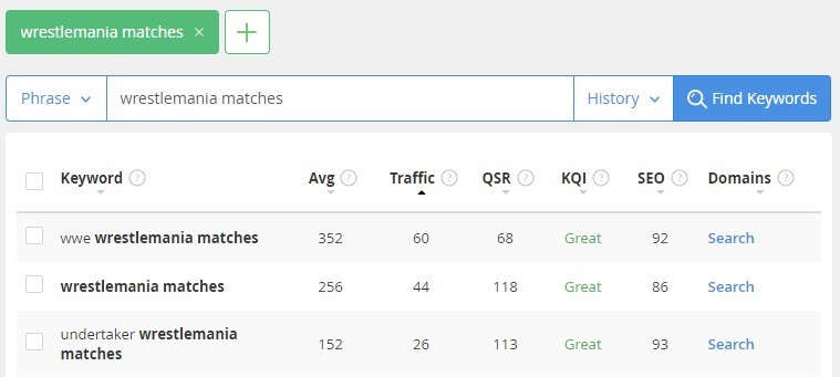 I did a quick keyword search in Jaaxy, and it turns out that just the phrase "wwe wrestlemania matches" is a pretty highly searched, low competition key word. And that is just on Wrestlemania.