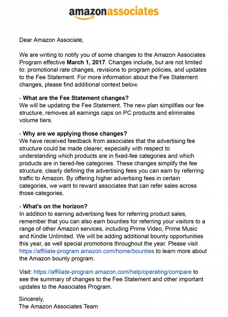 - Amazon is making some changes to their affiliate program (the Amazon Associates Program) that will go into effect beginning on March 1, 2017. Changes include: promotional rate changes