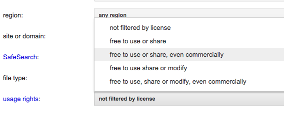 Once the "Advanced Search" screen comes up, scroll down towards the bottom of the page until you see a drop down for "Usage Rights"