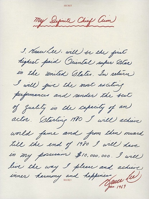 Bruce Lee is one of the most fascinating people I have ever come across. When you look up Tenacity in the dictionary, they should have a picture of Mr. Lee. Note how short and concise the statement is "I, Bruce Lee, will be the first highest paid Oriental super star in the United States" while saying so much more. For instance, he states "the first highest paid." he does not only want to be first but also wants to be the highest paid which was very astute if you ask me. I mean, you can be #1 in the rankings and still not be the highest paid.