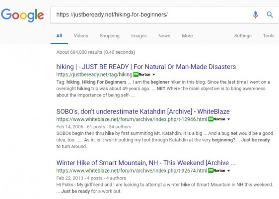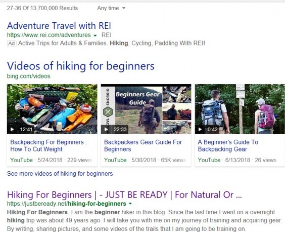 Checked my key word phrase hiking for beginners at 10:00 a.m. and found my post on page 4 of a bing search.