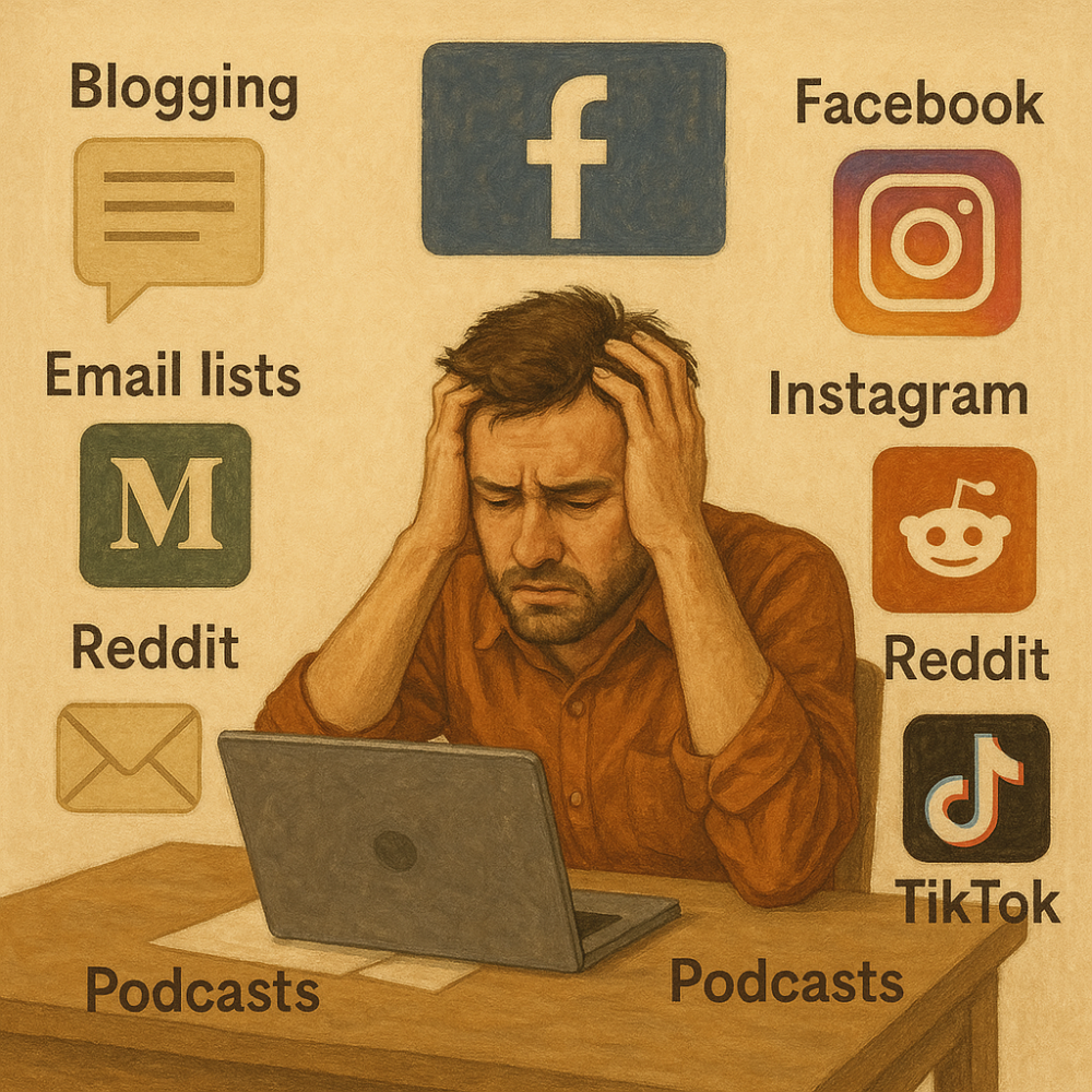 Blogging. YouTube. Facebook. Instagram. Email lists. Medium. Reddit. TikTok. Podcasts. All at Once:- It's TOO MUCH!!