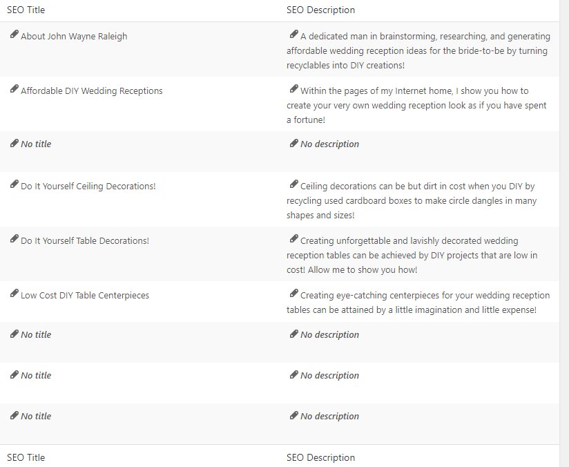 Today marks the end of three weeks with Wealthy Affiliate and I have completed 90% of course two. Today, when I was reading about SEO, the lights finally came on upstairs! In the last few weeks, I had been noticing that there was No title reading under SEO Title and No description reading under SEO Description on all of my pages and posts. I took a screenshot to show any misunderstandings.