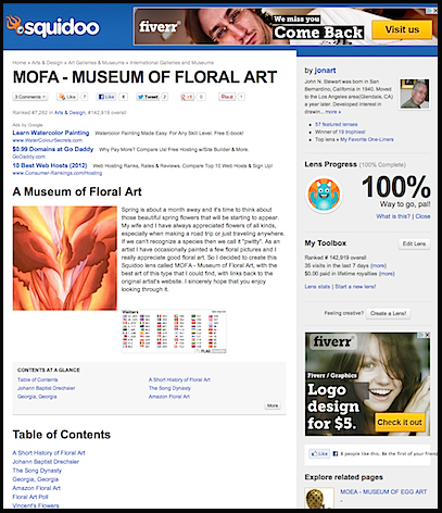 I was going to call this "Creating A Squidoo Lens in Two Hours or Less For Dummies", but I think it's already out there on the web. I woke up with an idea for a lens this morning titled "MOFA - Museum Of Floral Art". It is #4 in a series of Squidoo lenses that I've done in the last year or so.