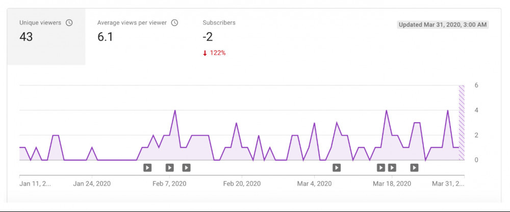 In addition to publishing one blog post per week, my goal is to also publish one Youtube video per week. There are currently 13 videos and 7 subscribers. I get about one visitor every two days. Pathetic, but I think expected. Again, two years from now, I'd like to see a different graph.