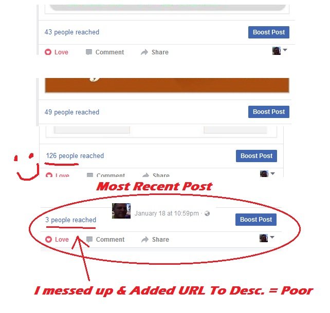 The last post was a test (I forgot haha) to see if I was just going crazy or not. I posted my website post's url on FB like I had been doing it - By putting the URL in the description my post only reached 3 people which is pretty dismal.