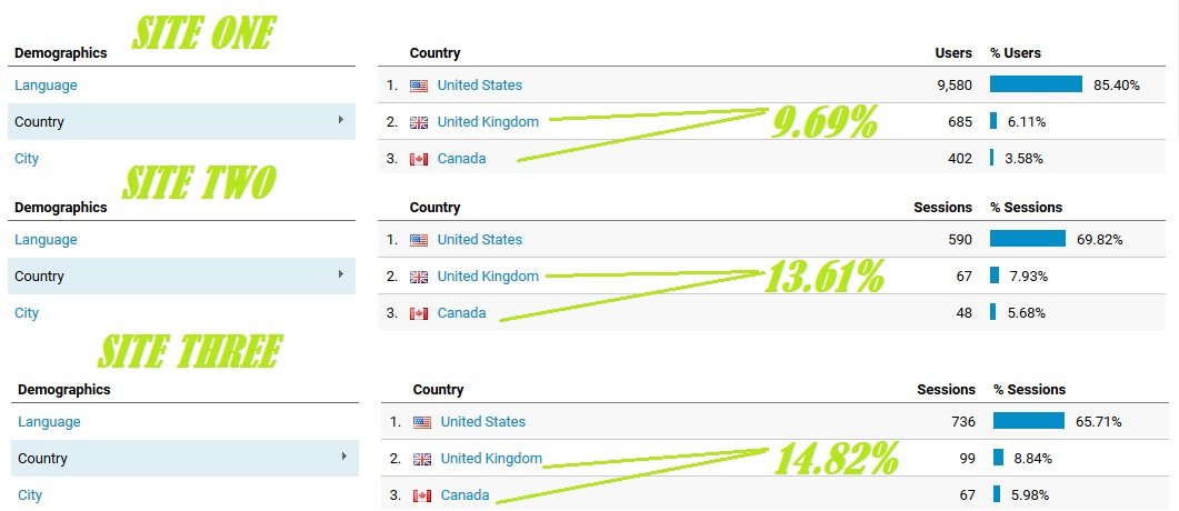 Below is the percentage of the top 3 countries for traffic to just 3 of my sites. I am only just NOW realizing that 2 of my sites have about 14% traffic to Canada and the UK. Wow, I have missed out on some sales!. But it's not too late for me or anyone. With all my sites combines, I'm sure I have a decent amount of traffic from these two countries. They need to buy things and currently I am only sending them to the USA, so now I must act!. Amazon one link, here I come.