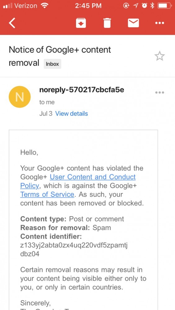 usually people get this notification when they have posted an affiliate link directly on G+.