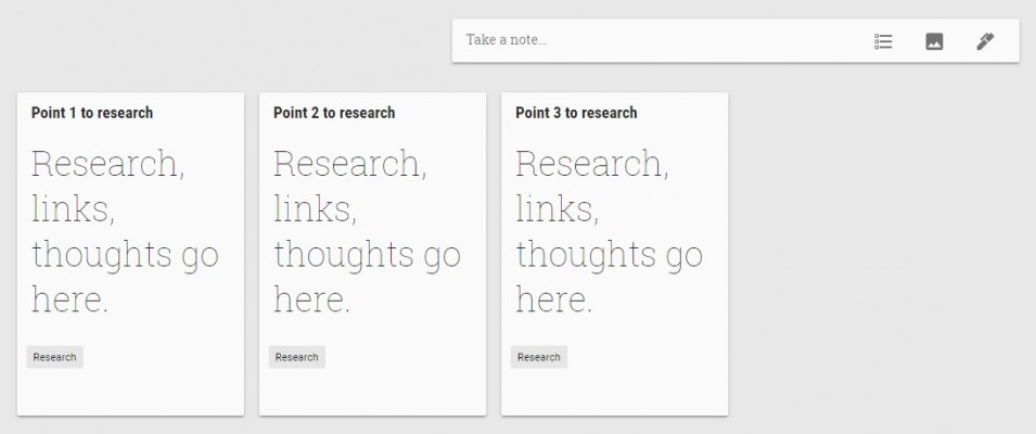 (Of course you would change "Point 1 to research," etc to fit your specific need. For example, "Migraine Cures" could be its own Keep note.)
