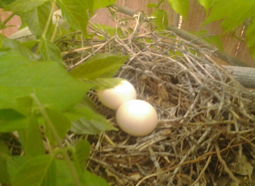 I love nature. This year another dove took up residency in the nest. She laid 2 eggs but then one day did not return to the nest, I am guessing that a cat may have got her. I will sadly remove the unhatched eggs allowing for the next new mother to move in. I will now plant the tree there (which is still in a pot since I didn't want to disturb the other dove) and the new tenant will have an evergreen tree as shelter.