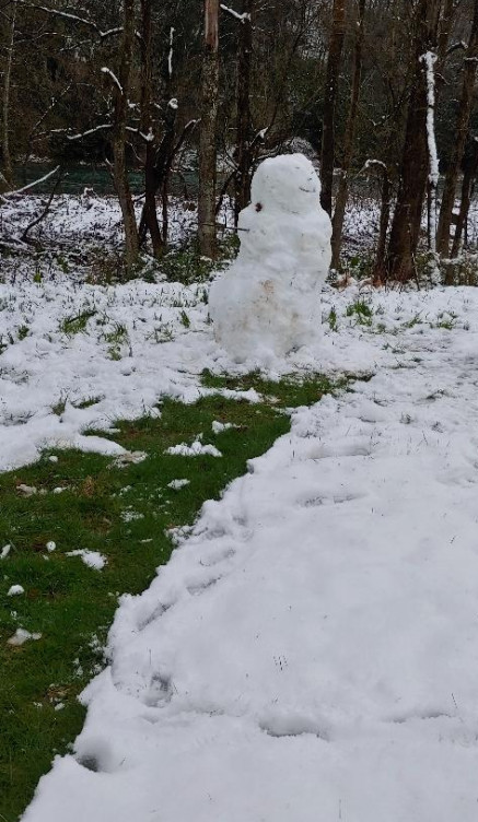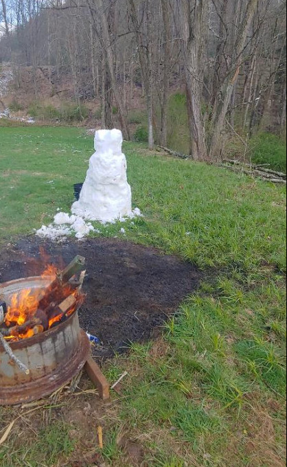 There's got to be a first time for everything and roasting hot dogs over a campfire with a snowman sitting on green grass nearby was great!