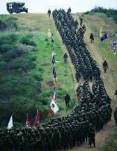 The long line of Marines marched at an unbelievable pace of over 6 mi./hour. The front of the column moved fast and the Marines in the middle and at the end had to run to keep up. The line weaved in and out like an accordion. Gunnery sergeants walked up and down the line telling us we could not run- we had to walk and stretch our legs which was so painful. I knew my feet were bleeding and my thighs felt like they were being ripped off my body. My left arm fell asleep, lack of blood circulation and hung limply at my side.