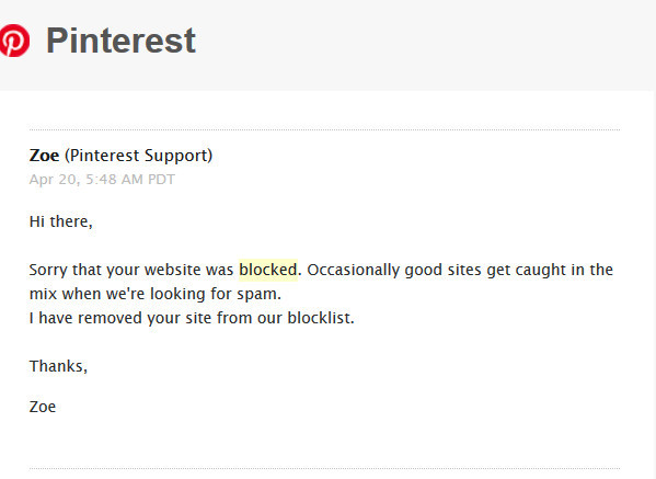 According to Pinterest, my account was blocked based on the premise of it being/leading to SPAM.