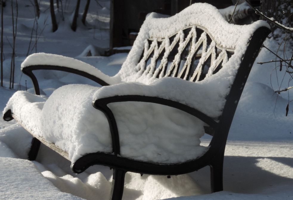 As I'm at home, working on my websites, I look out the window to the garden bench, still covered in snow.