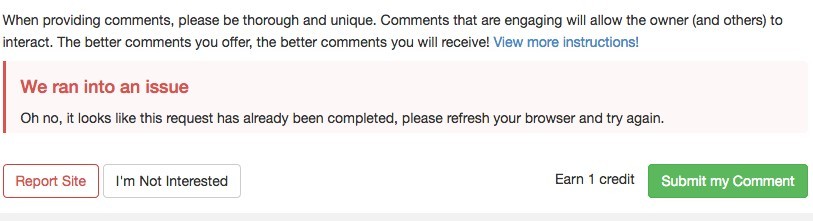 I completed one and was offered another one. When I comment I like to make sure that I do a good job, so I read the article thoroughly and started writing a comment. All in all I was at least 15 minutes only to find when I went to submit my comment I got the message " this request has already been completed"