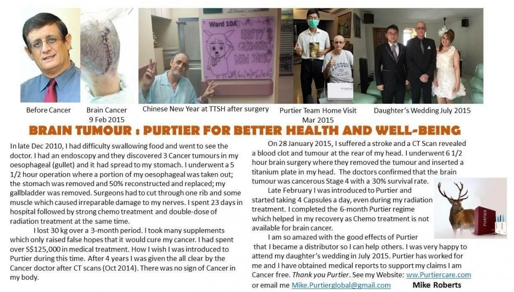 After Brain surgery I underwent Brain Radiation (not easy as again locked face down in a cast while I was being zapped) but am over this now and I am taking Stem cell Health supplements from New Zealand that my friend introduced to him and thankfully I trusted him so since March 2015 I have been taking Purtier (Stem cell) which as helped many cancer pple, am impressed so become distributor so I can promote good health to all, as