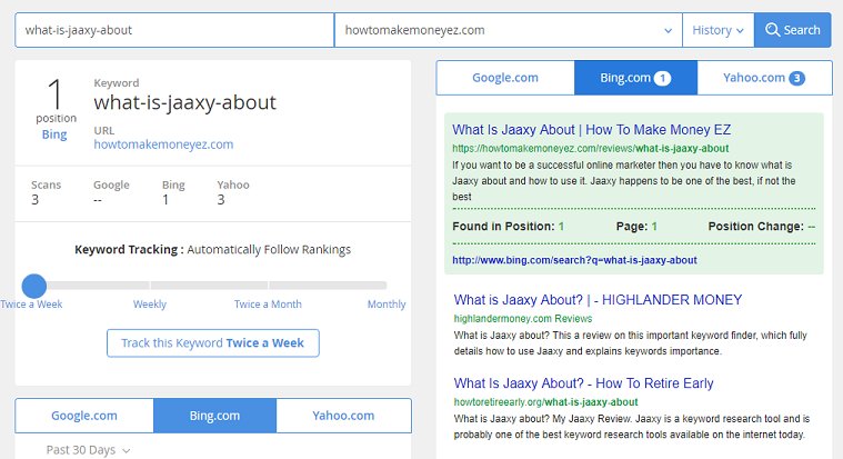 This old Jaaxy Review βWhat Is Jaaxy About β had already been indexed and ranked! It has aranking of Page one, Position three on Yahoo and Page one, Positionone on Bing!