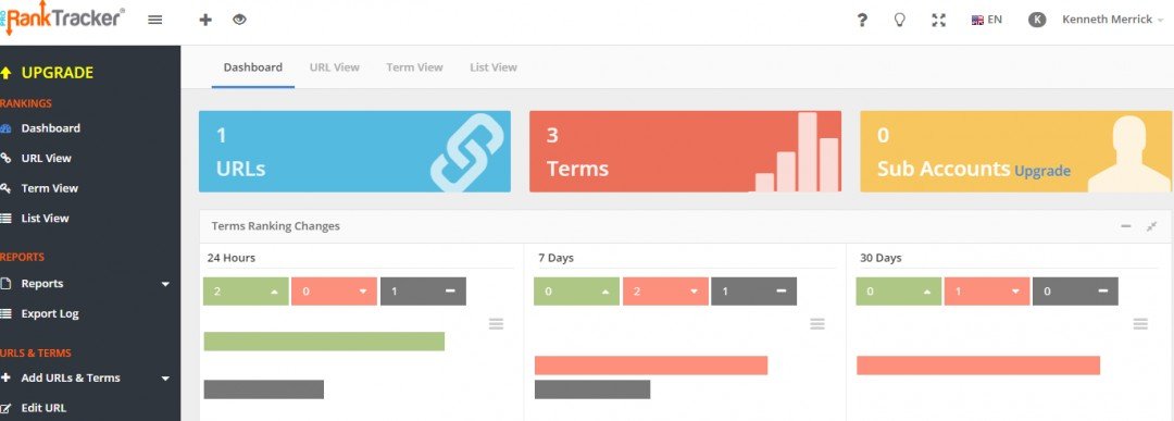 I, of course, am talkingabout their free service plan which allows me to enter and track Twodifferent search terms (keyword) and two separate URLs. This free plan sends an email notification twice a day, or if there is a change in ranking on one of my URLs.
