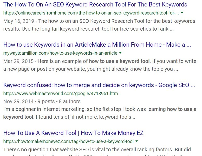 Now let me be clear, NO, this is not my primary keyword term to use in my next post. It is going to be a section inside the post in a heading, "how to use a keyword tool". When I scrolled down the page (past the ads) My website is listed in the fourth postion - under this keyword term!