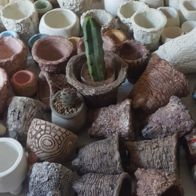 It looks like something is missing. It is not fair, even on a pile of the messy unfinished planters, paints, brushes, etc. Hey...they are planters for plants. There is no living thing such as plants around the messy pots.