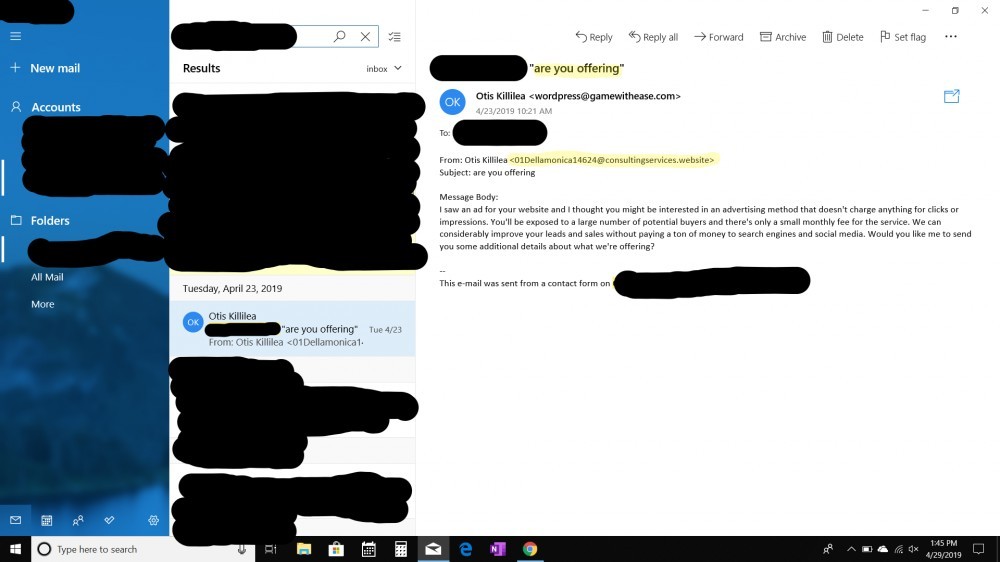 I have highlighted two items that serve as good indicators for spotting spam. The title was highlighted because it is not relevant to my website at all. Are we offering? Offering what? There was no context to the title or subject that made grammatically sense.