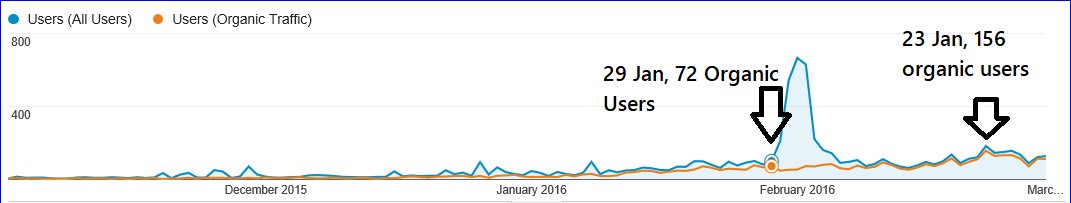 In my previous post I forget to include the number of users on the particular day, thus I have included here. As you can see on 29 Jan, I was having only 72 organic users. But on 23 Jan I had 156 organic users. It's slightly double the number of visitors.