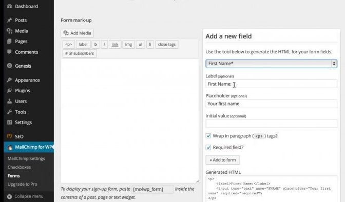 The first step is to go to your plugins menu, click on the "Add New Plugin" button. Search for a plugin called MailChimp and download the one called MailChimp for WP.