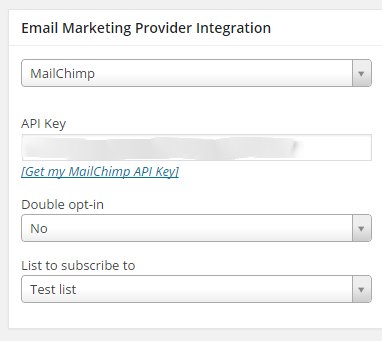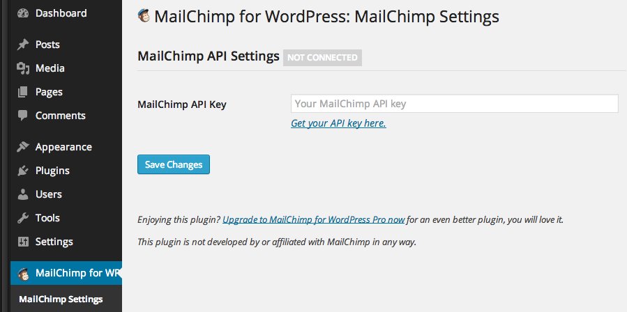 To get your MailChimp API key, click on the "get your API key here" link right below the box where you would put the API key. This will take you to the MailChimp login page. After signing in click on the button that says "Create A Key." Copy the key then head back to your Wordpress dashboard and paste the key in the API key box.