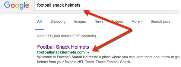 A few years ago, these type of domains had unbelievable PULL within search and though it has been minimized somewhat with recent Google updates, keyword rich (or exact match) domains are still very powerful and get amazing rankings as in the case of the footballsnackhelmets.com. You can see it ranks under the keywords it target, "football snack helmets".
