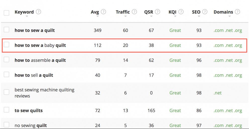 If I had a website in this niche and I was choosing a keyword, I would likely be look for a QSR (true competition) under 100. I decided to choose the keyword "how to sew a baby quilt". It is under 100 QSR, and being under 50 it is a keyword that I could likely rank well for even with a newer website.