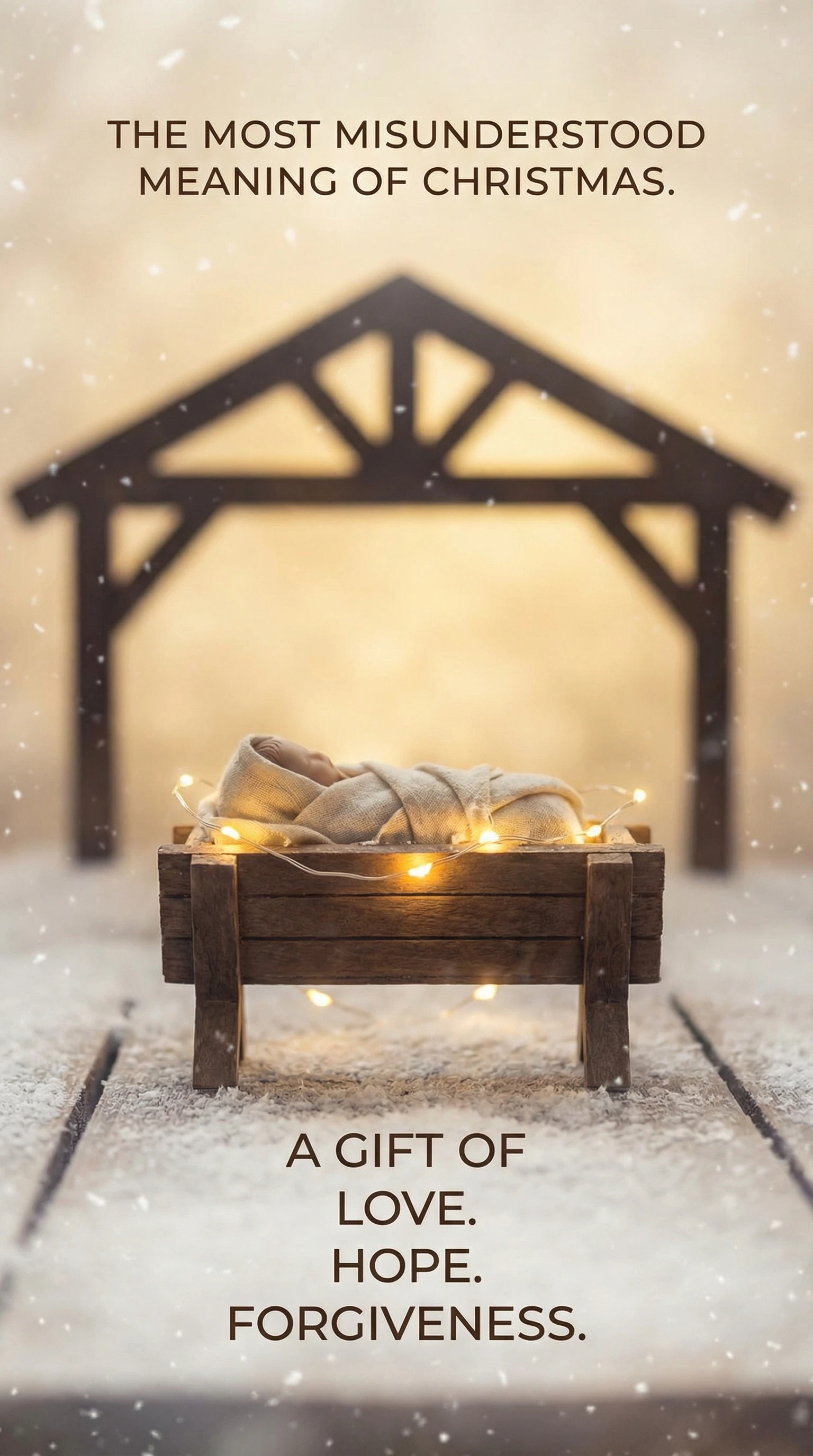 📝 Image Studio Prompt: 'A warm, glowing Christmas scene with a wooden stable silhouette in the background. Soft golden lights shine on a simple manger with baby Jesus wrapped in cloth. Snow gently falls around the edges. At the top: “The Most Misunderstood Meaning of Christmas.” At the bottom in simple clean text: “A Gift of Love. Hope. Forgiveness.” Colors: gold, white, warm brown. Style: minimal, peaceful, reflective.'