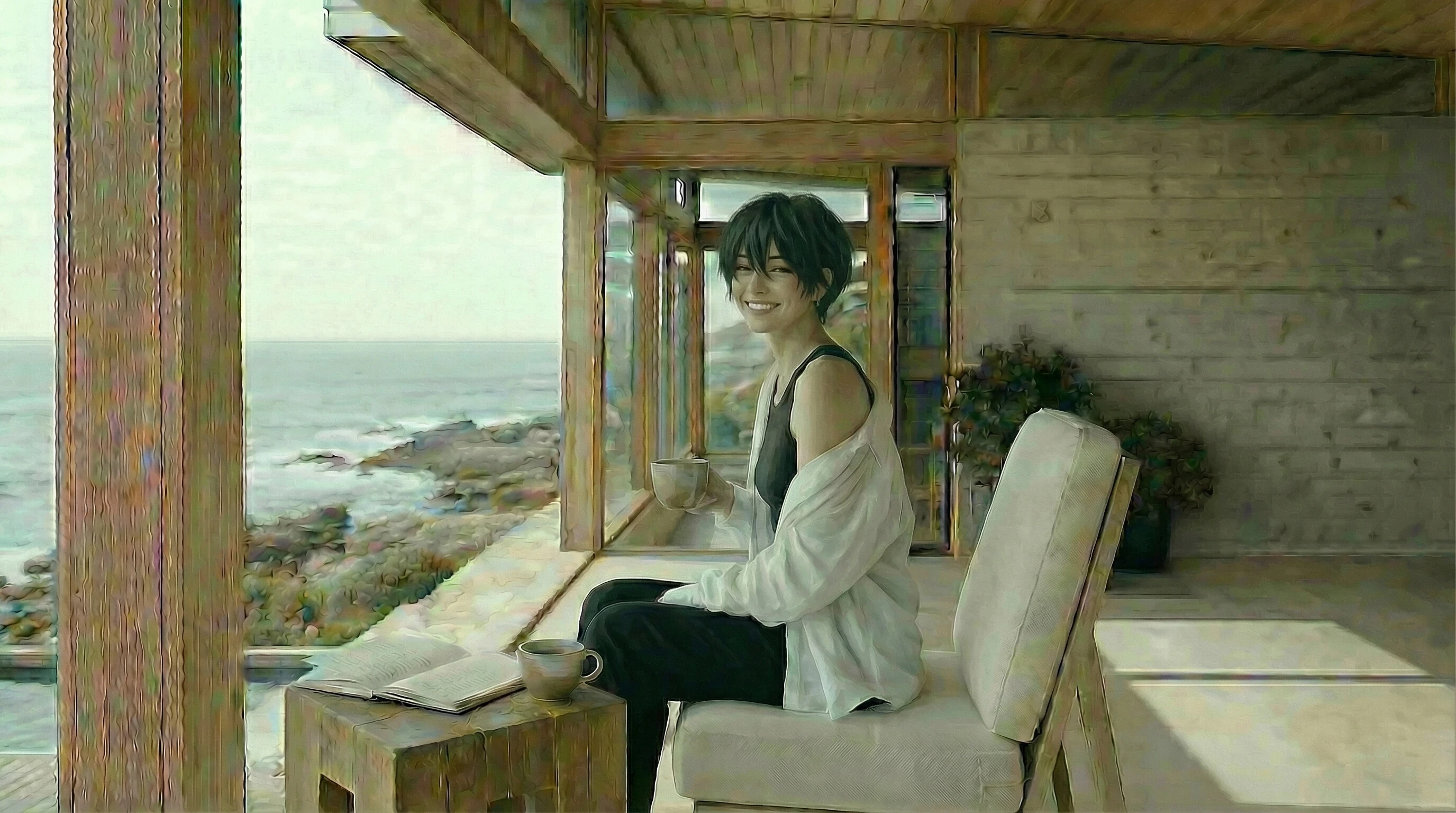 My prompt was asking for someone with a sporty, athletic brand-model body, sitting casually in my seaside wabi-sabi villa, enjoying coffee and reflective notes โ radiating the confidence and happiness that come with financial freedom.