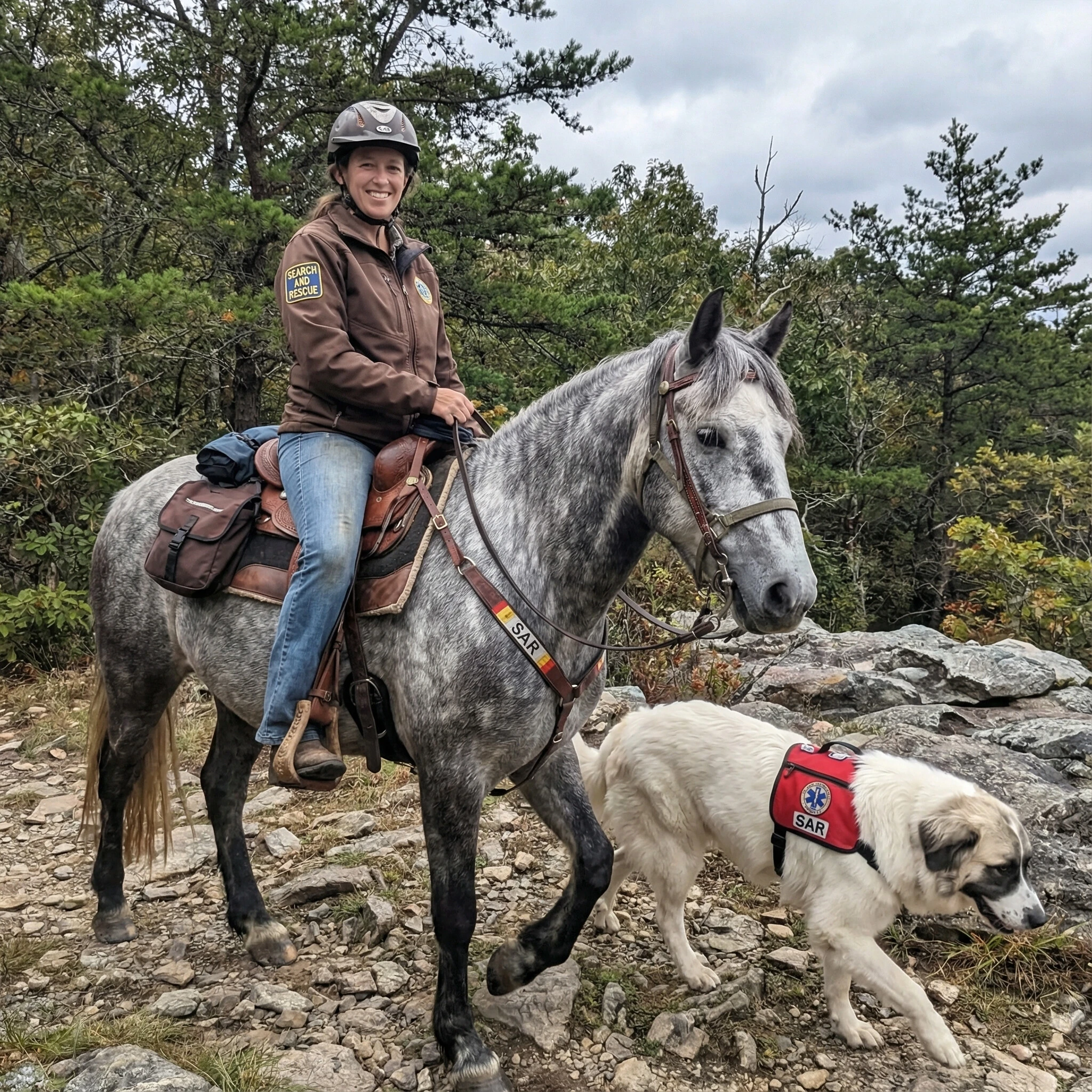 My image shows a realistic vision of my 2026 goal achieved. I'm currently training in mounted search and rescue with my senior horse, my goal is to complete training and become an active msar volunteer. My studio image is me with my dream horse (image studio created, I haven't found her yet) along with my dog lending a helping paw.