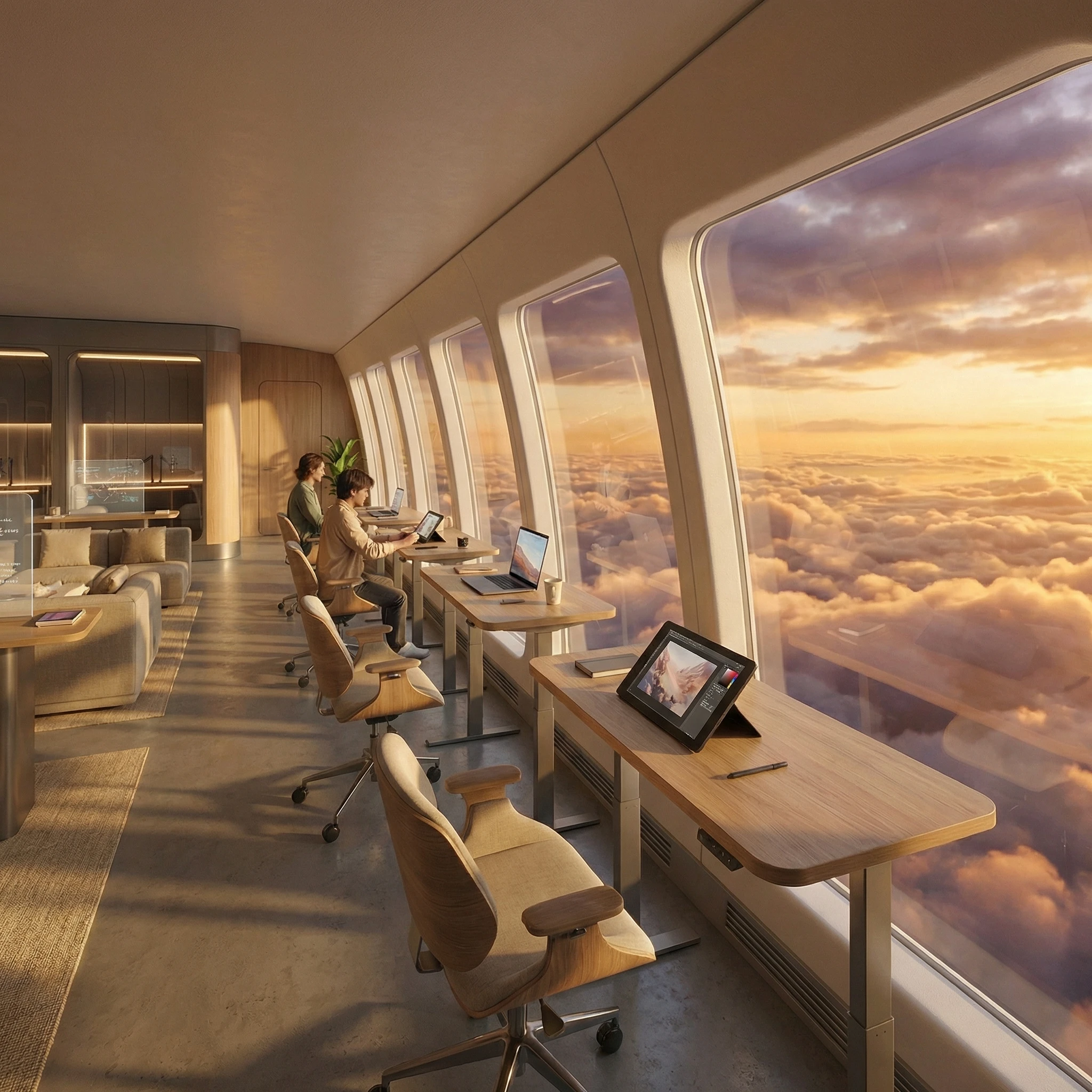 Instead of rows of seats, the interior is built around window-side workstations, collaboration lounges, and quiet focus zones, all designed to turn flight time into meaningful creative time.