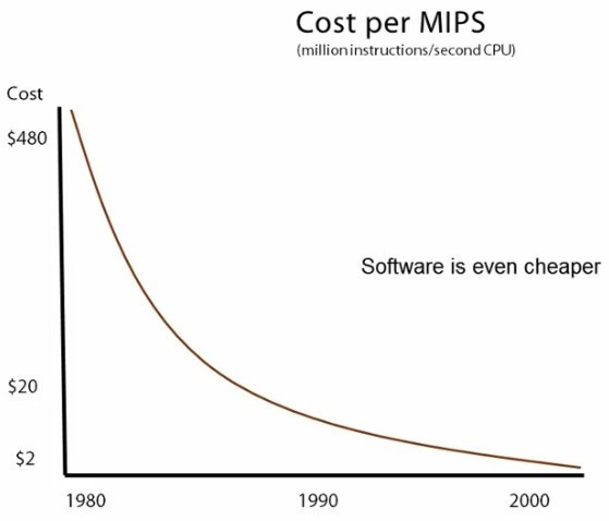 In the realm of technology, it's not just the knowledge that has been devalued, so has the technology itself. Gone are the days when using or building technology required a small fortune in hardware and software. The cost of hardware of all types has crashed.