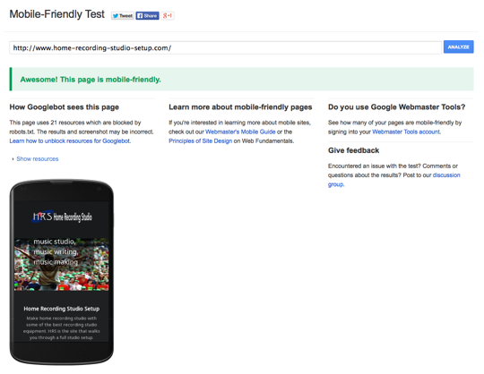 If you are wondering if your website is mobile optimized or not, you should use the mobile friendly testing tool that Google offers. Simply enter your website link in the URL field and click on Analyze to see if your website passes or fails the test. Here is what the result looked like for one of my sites:
