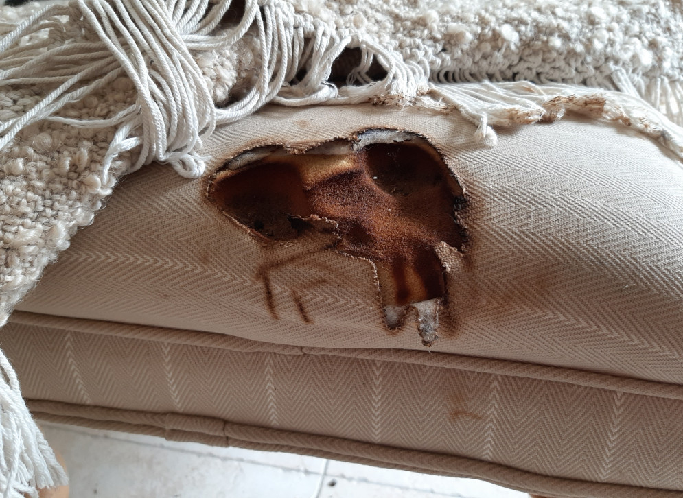 The photograph that you see here is the damage that was done to my settee by a spark that flew out the fire. And as you guessed correctly, the firescreen was not up.