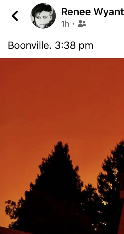 The sky is on fire, it is gleaming a rusty wine red ambiance in Boonville… the Oak Fire in Willits. My friend’s friend might lose her home ….The air is smoky outside and it’s getting worse.