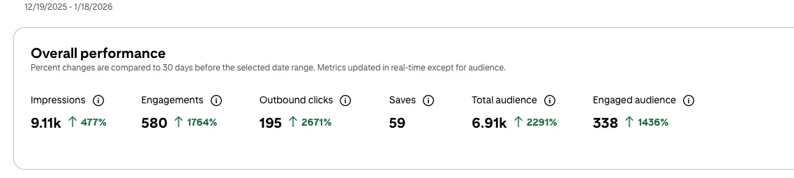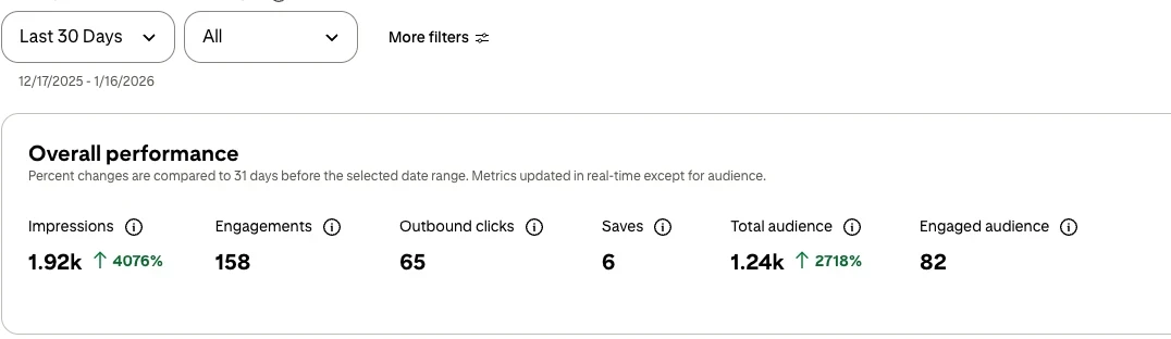 This is one account that I started brand new on about October 20th of 2025, but really came alive since December; this is the last 30-day jump: