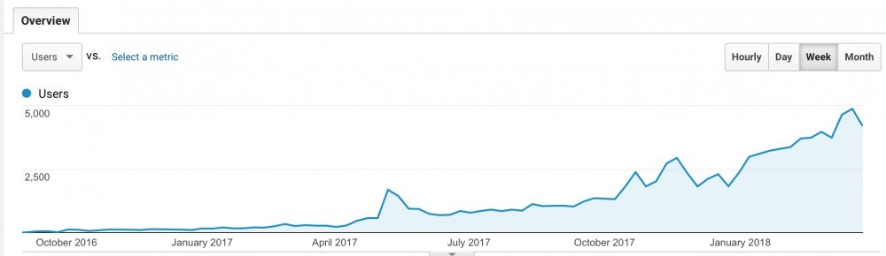 The cover image up top is the Google Analytics for the month of March (by day) and this is the 19 month trend (by week):