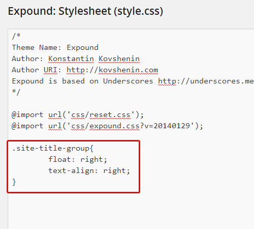 It seems div with class "site-title-group" is wrapping my title and description. So, we need to change its properties. Lets head back to editor and paste this code.