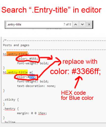 There it is. My class for heading(h1) is "entry-title". So its time to go to editor and edit it. Search for ".entry-title" in editor. And replace "color = #555;" with "color = #yourcolor;". Save and its done.