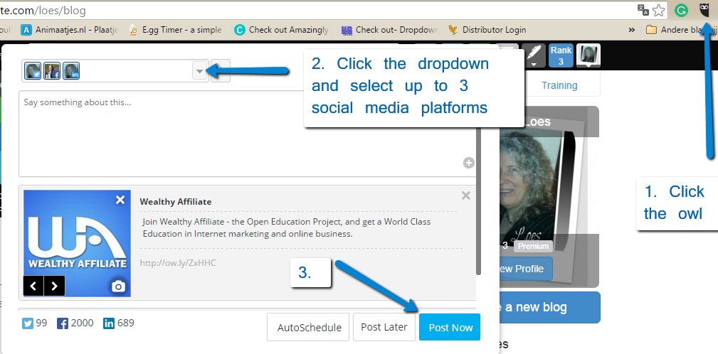 You get an owl(button) in your browser, and it automatically shortens the url and give a dropdown to the social media you have previously entered, adjust the message and post