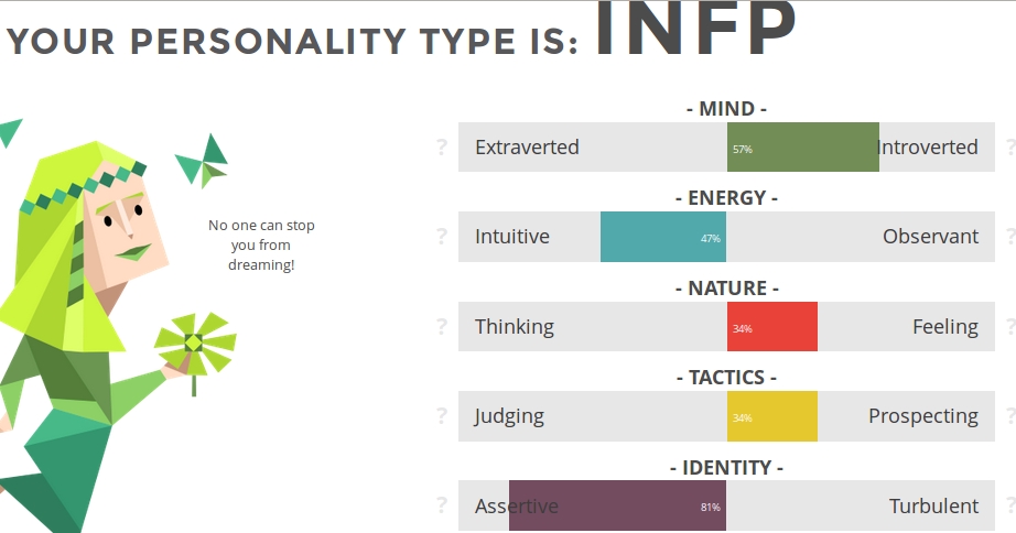 You are one of the Diplomats - an empathic and idealistic individual who enjoys exploring interesting ideas and prizes morality. You are known for your poetic nature, intuitive skills and pure, childlike enthusiasm.