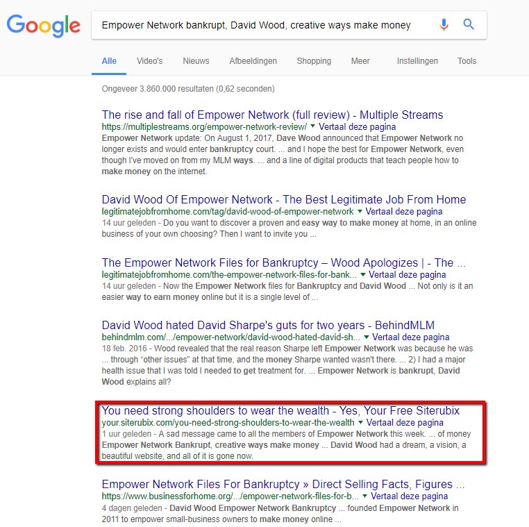 With all the keywords I used for this post, I am on no 1, when I add the keywords Empower Network Bankrupt David Wood, I am on page 3