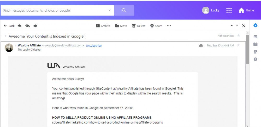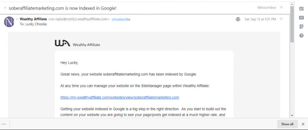 Iam super excited to share with the community that my website , Sober Affiliate Marketing, is now indexed by google. Better still, three days later i got another amazing notification from WA that my post "How to sell a product online using affiliate programs" also has been indexed.